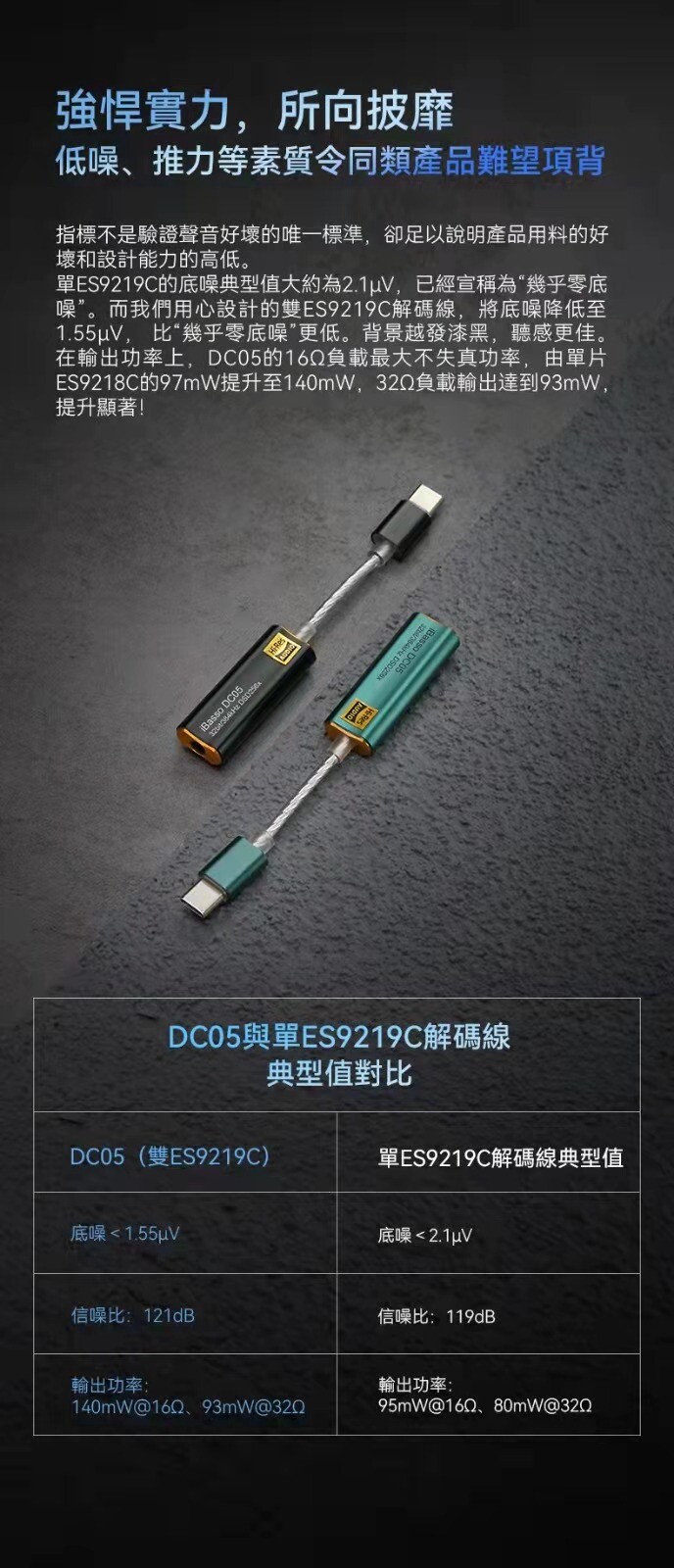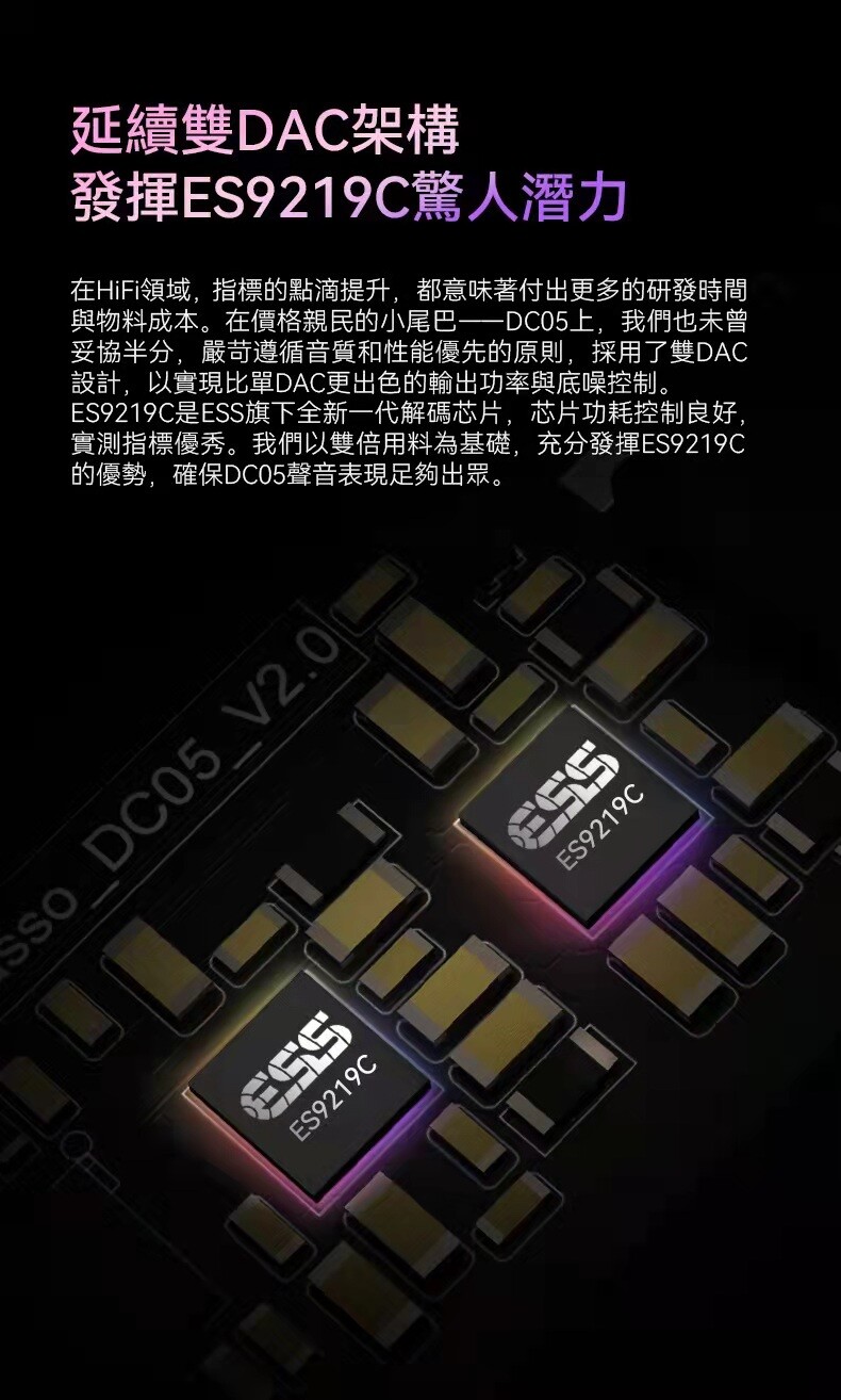 ES9219C是ESS旗下全新一代解碼晶片,晶片功耗控制良好,實測指標優秀。我們以雙倍用料為基礎,充分發揮ES9219C的優勢,確保DC05聲音表現足夠出眾。