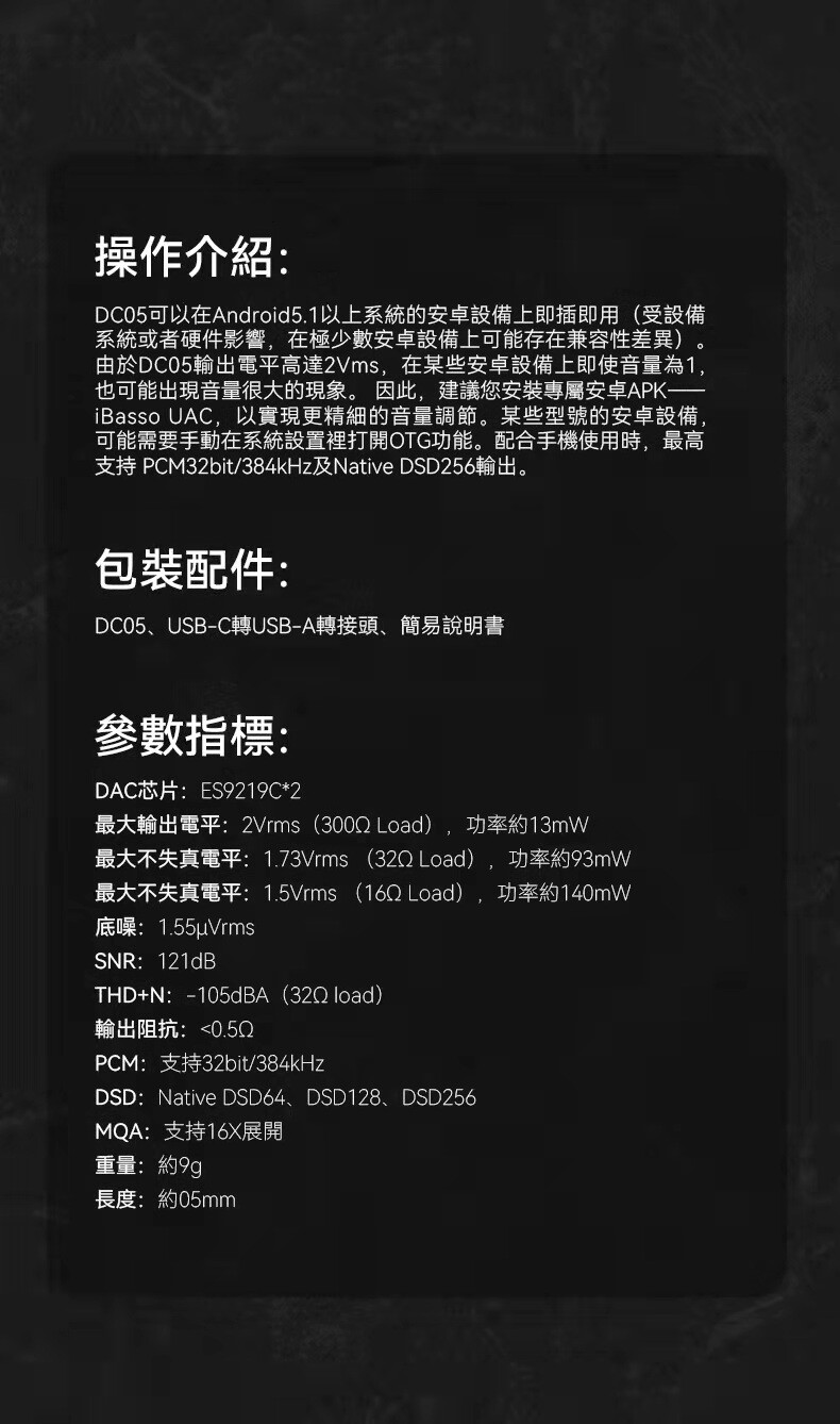 DC05可以在Android5.1以上系統的安卓設備上隨插即用(受設備系統或者硬體影響,在極少數安卓設備上可能存在相容性差異)。由於DC05輸出電平高達2Vms,在某些安卓設備上即使音量為1,也可能出現音量很大的現象。因此,建議您安裝專屬安卓APK——iBasso UAC,以實現更精細的音量調節。某些型號的安卓設備,可能需要手動在系統設置裡打開OTG功能。配合手機使用時,最高支持 PCM32bit/384kHz及Native DSD256輸出。
