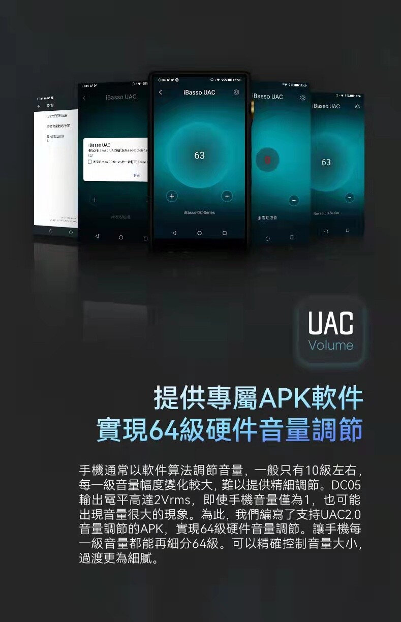手機通常以軟體演算法調節音量,一般只有10級左右,每一級音量幅度變化較大,難以提供精細調節。DC05輸出電平高達2Vrms,即使手機音量僅為1,也可能出現音量很大的現象。為此,我們編寫了支援UAC2.0音量調節的APK,實現64級硬體音量調節。讓手機每一級音量都能再細分64級。可以精確控制音量大小,過渡更為細膩。