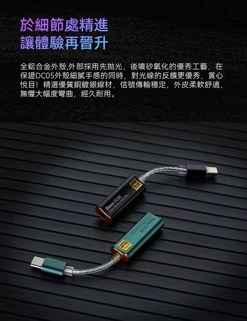 全鋁合金外殼,外部採用先拋光,後噴砂氧化的優秀工藝,在保證DC05外殼細膩手感的同時,對光線的回饋更優秀,賞心悅目!精選優質銅鍍銀線材,信號傳輸穩定,外皮柔軟舒適,無懼大幅度彎曲,經久耐用。