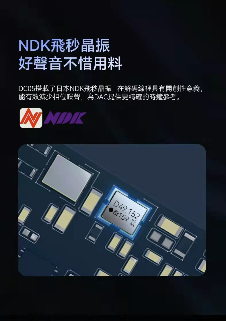 DC05搭載了日本NDK飛秒晶振,在解碼線裡具有開創性意義,能有效減少相位雜訊,為DAC提供更精確的時鐘參考。