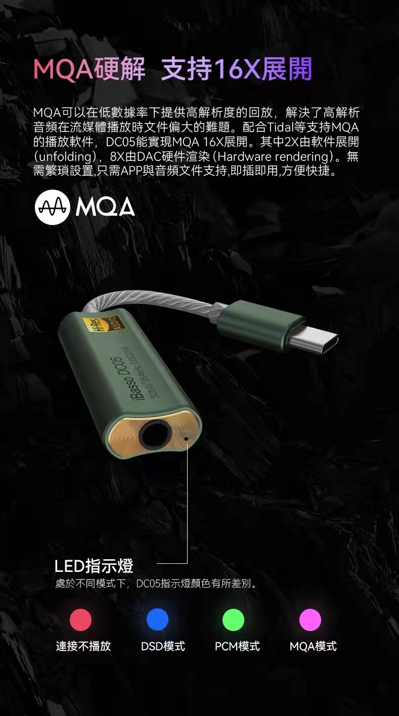 MQA檔可以在低碼率下提供高解析度的重播,解決了高解析音訊在流媒體播放時檔偏大的難題。配合Tidal等支援MQA的播放軟體,DC05能實現MQA 16X展開。其中2X由軟體展開(unfolding),8X由DAC硬體渲染(Hardware rendering)。無需繁瑣設置,只需APP與音訊檔支援,隨插即用,方便快捷。