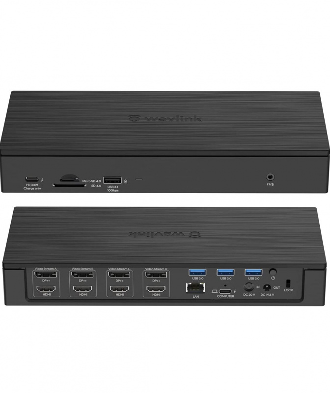 - 20 合 1 企業級擴充基座:四個 4K 通用擴充基座是大型企業和設計師的理想選擇,提供 20 個連接埠:4 個 Displayport 1.2、4 個 HDMI 2.0、1 個 2.5Gbps 乙太網路連接埠、1 個 SD 4.0 卡 eader, 1 x TF 讀卡器,1 x 4 孔 3.5 公釐手機插孔,3 x USB3.0-A,1 x USB3.1-A,1 x Type-C,1 x DC 吋,1 x DC 輸出,1 x USB-C(上行)。