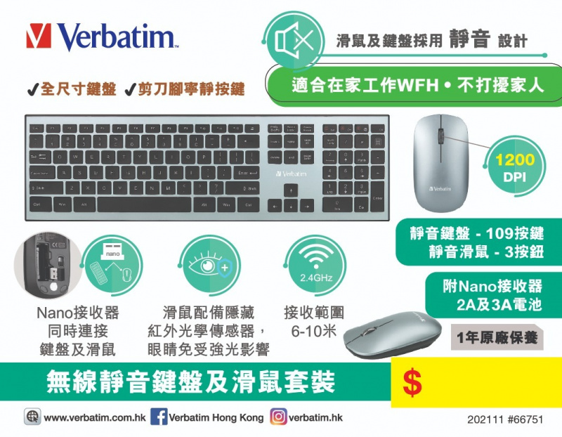 Verbatim 無線靜音鍵盤及滑鼠套裝