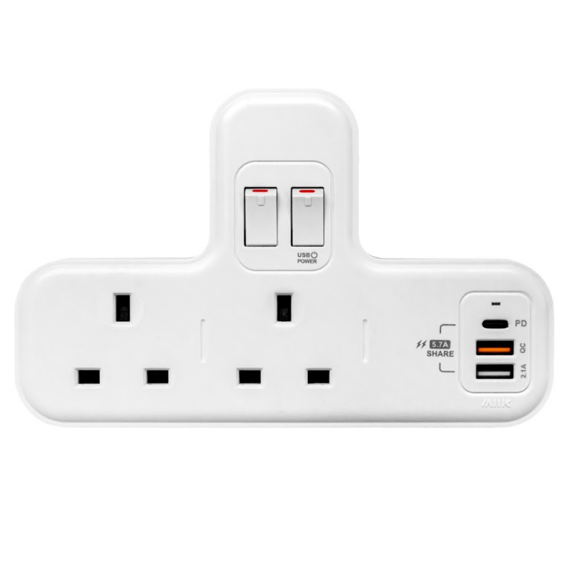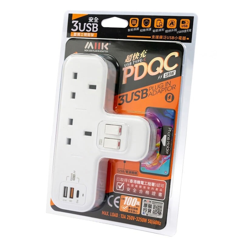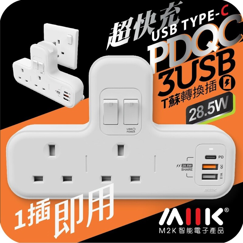M2K 218PD T型蘇頭分插 (快充版) [13A x 2/USB/USB QC3.0/TypeC PD18W]