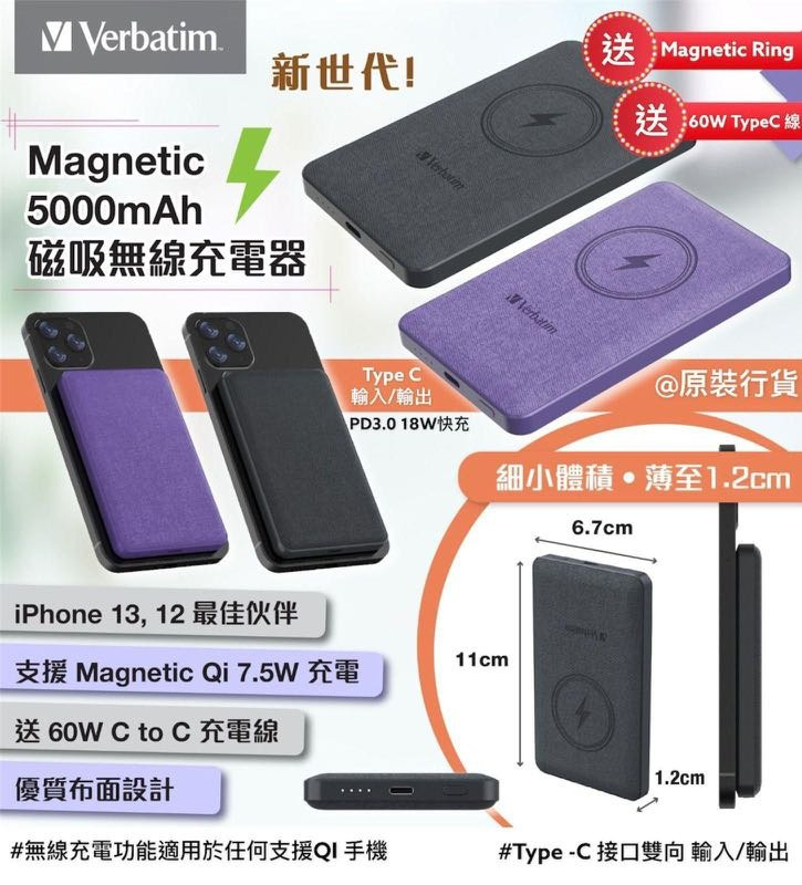 Verbatim 5000mAh磁吸無線充電器提供雙重充電功能,既是兼容MagSafe的無線充電器,也可作為一般5000mAh流動充使用,最多可為兩部設備充電。適用於iPhone 13 / iPhone 12及其他支援Qi無線充電的智能手機。