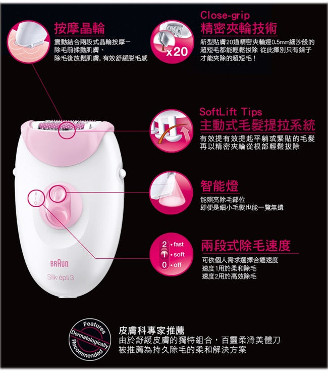 輕鬆擁有長效柔滑的美肌,震動結合兩段式晶輪按摩,先揉動、後放鬆肌膚,有效舒緩不適感,Close-grip 精密夾輪技術,20 道精密夾輪,輕鬆拔除 0.5 公釐超短毛,SoftLift Tips 主動式毛髮提拉系統,智能燈-引導拔除最細微毛髮,柔和、高效兩段式除毛速度,刮拔兩用,附修剪梳,皮膚科專家推薦。