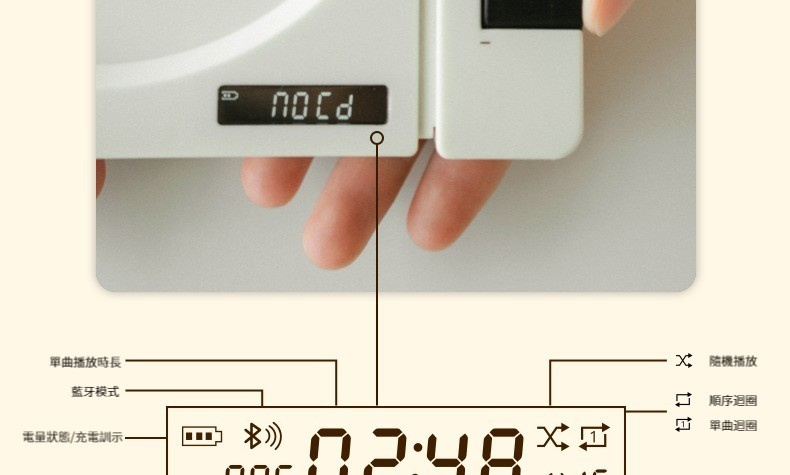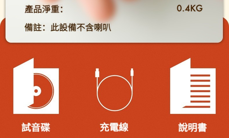 - 包裝清單:試音碟、充電線、說明書