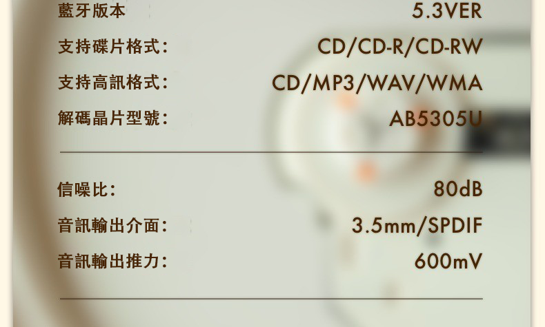 - 支持音訊格式:CD/MP3/WAV/WMA