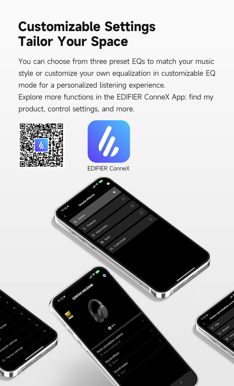 - EDIFIER ConneX App 相容以實現附加功能:個人化控制設定、選擇預設均衡器等。