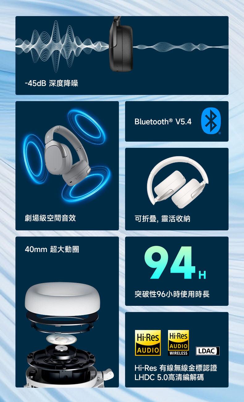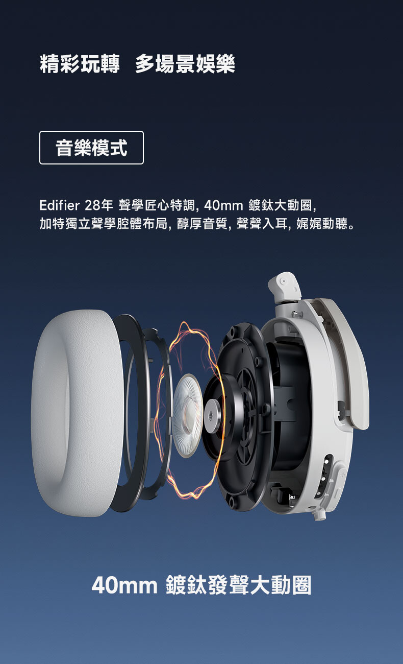 - 40mm 動態大動圈,搭配鈦塗層複合膜片。