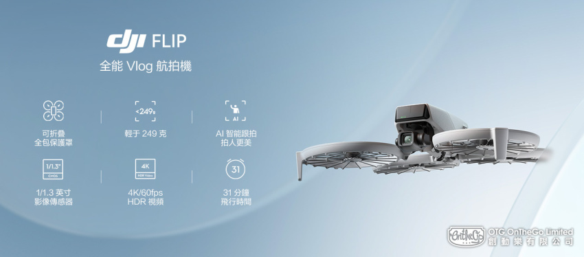DJI Flip 是 DJI 無人機革新之作,以精巧之姿,攜卓越影像實力震撼登場。無需遙控器也能掌上起飛,隨拍隨行;更有 AI 智慧跟拍,將主角穩穩鎖定在 C 位;創新可折疊全包保護罩設計,輕巧與安全兼得。 能遠攝風光,亦能近拍人像,將美好盡收鏡頭之下。