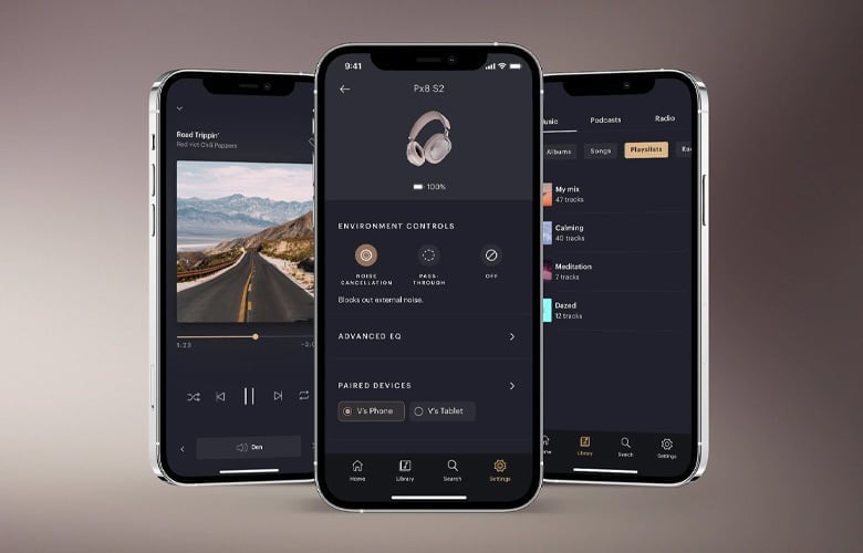 利用 Bowers & Wilkins 音樂應用程式來個性化調整 Px8 S2,以符合您的個人品味,發現您下一個喜愛的專輯,並選擇您所需的噪音取消類型。現在,借助新的五段均衡器,您可以更精確地根據個人喜好調整音樂。