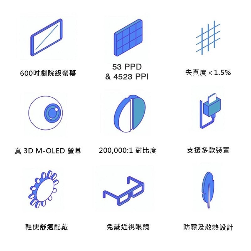 - 虛擬大螢幕|觀看成像如距離 20 公尺觀看 600 吋大螢幕,一戴上如同進入電影院。