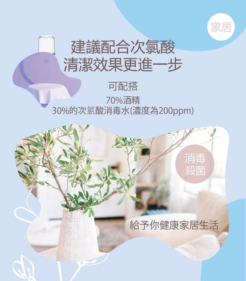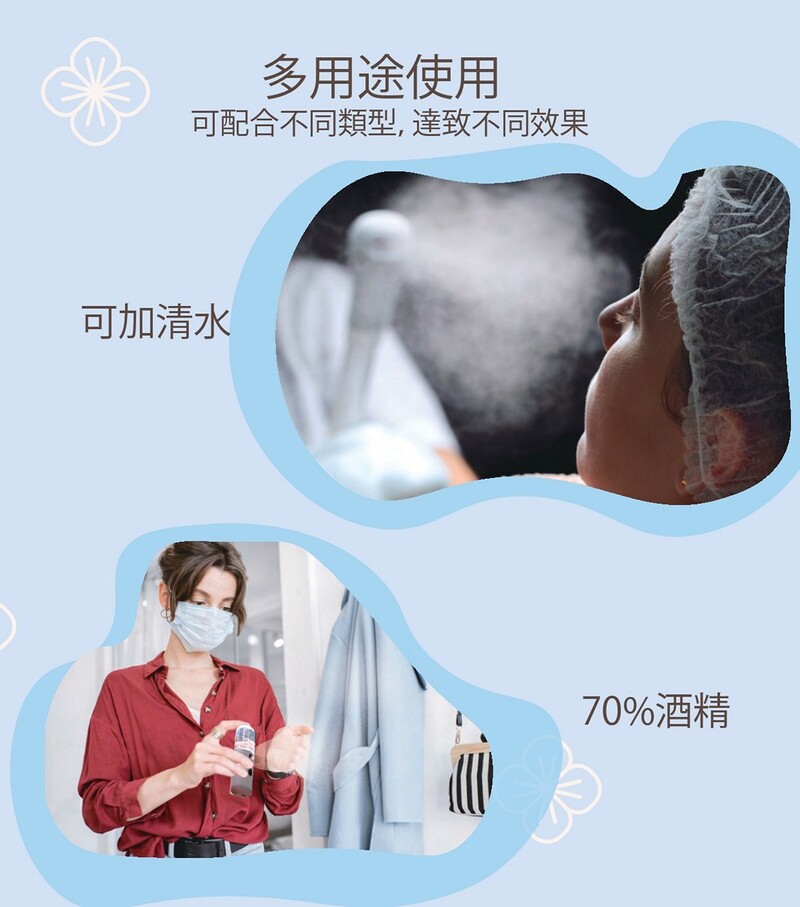 多用途使用:可加清水,爽膚水,牛奶,皮膚精華素, 70%鹽水, 70%酒精, 30%的次氯酸消毒水(濃度為200ppm)