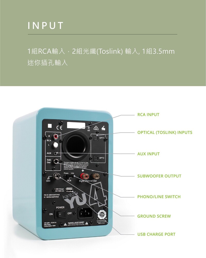 -1組RCA輸入,2組光纖(Toslink) 輸入, 1組3.5mm迷你插孔輸入