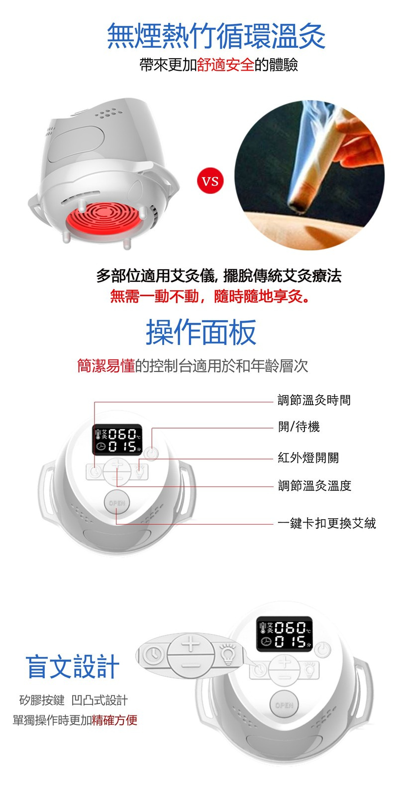 調節溫灸時間/開/待機/紅外燈開關/調節溫灸溫度/一鍵卡扣更換艾絨