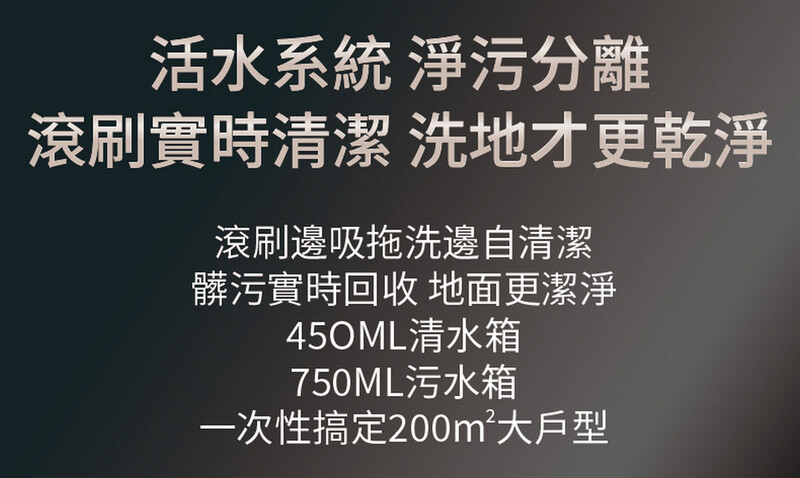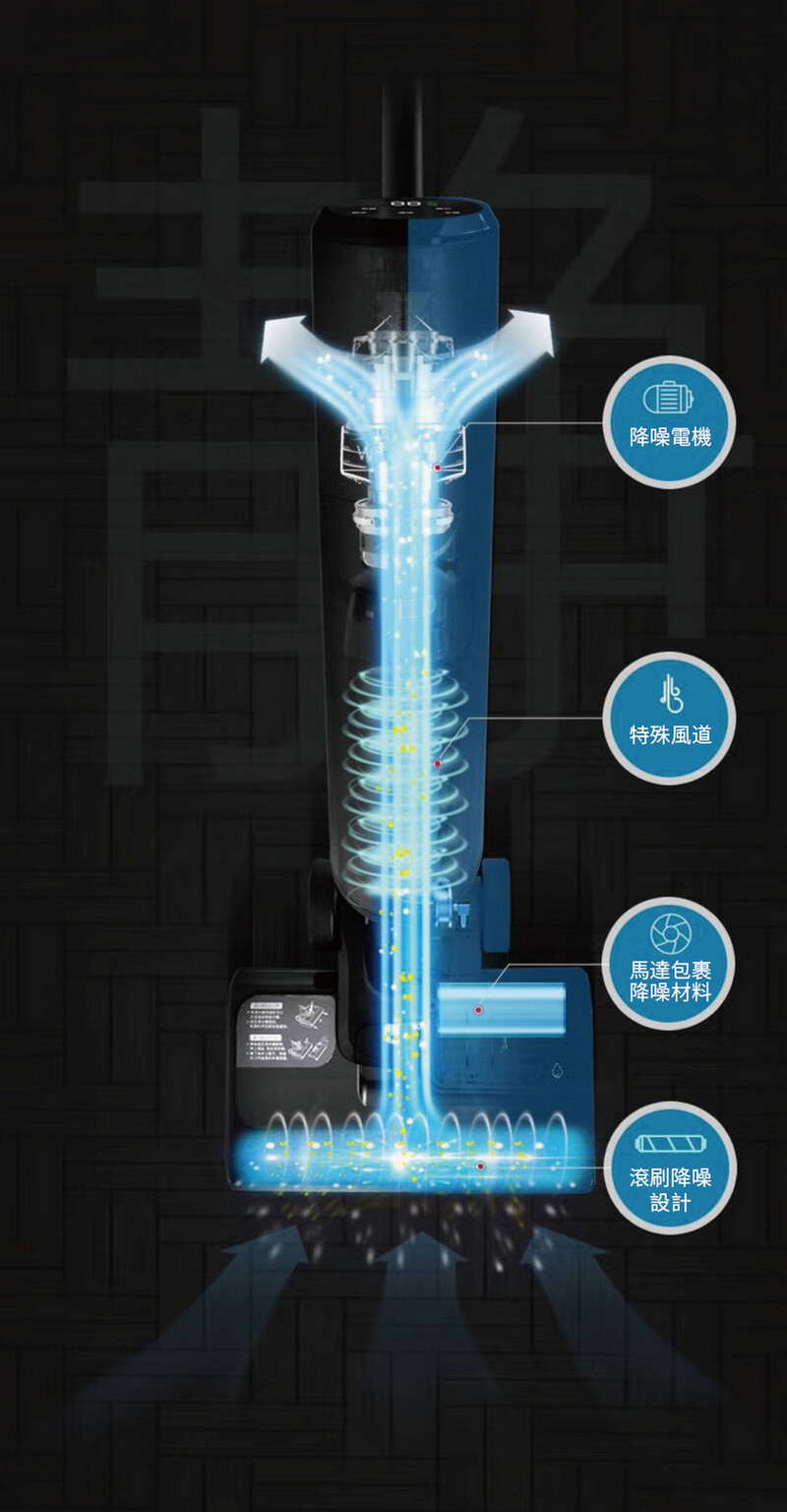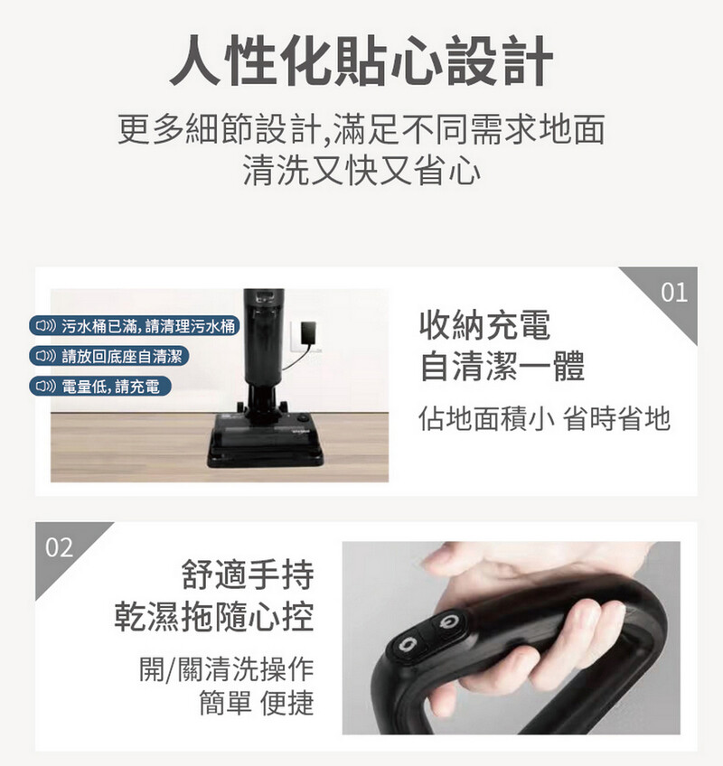 * 專利機身設計: 清水箱設於底部,吸塵洗地用力及轉向更平衡及輕鬆