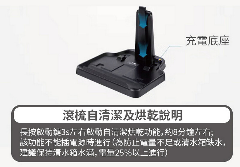 * 一鍵自動清洗+自烘乾功能更方便及可延長滾刷使用壽命, 減少異味產生