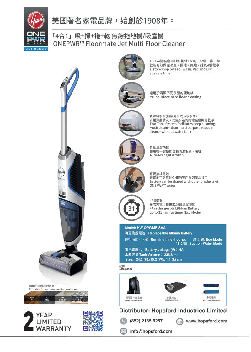 - 內附Hoover Renewal Multi-Surface Cleaning Formula (177 ml) 清潔劑1支