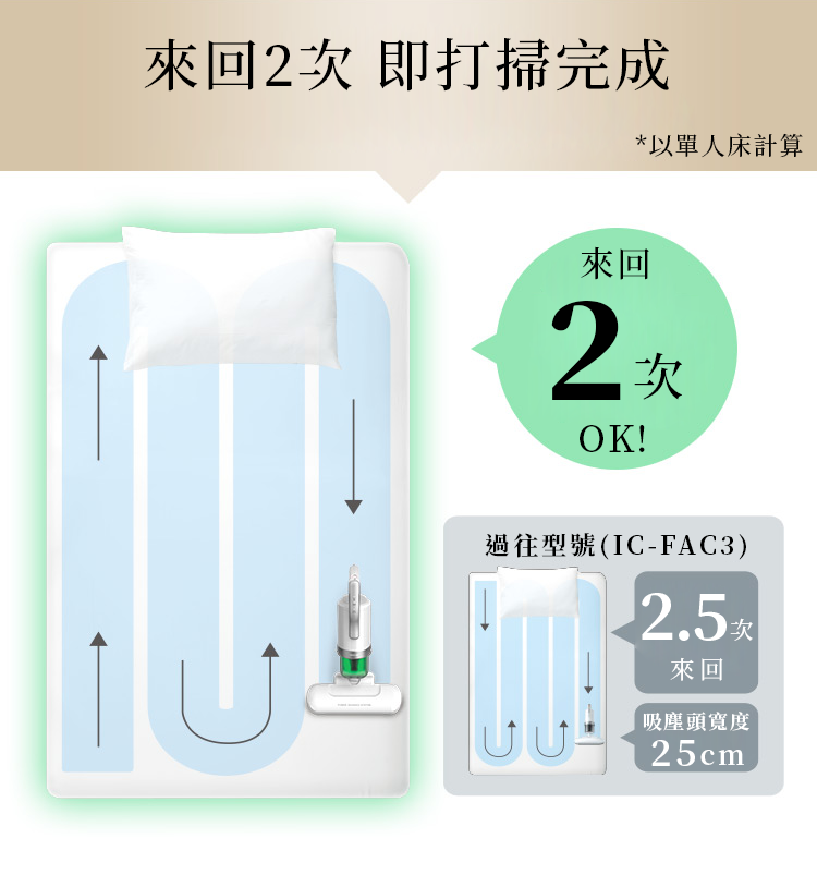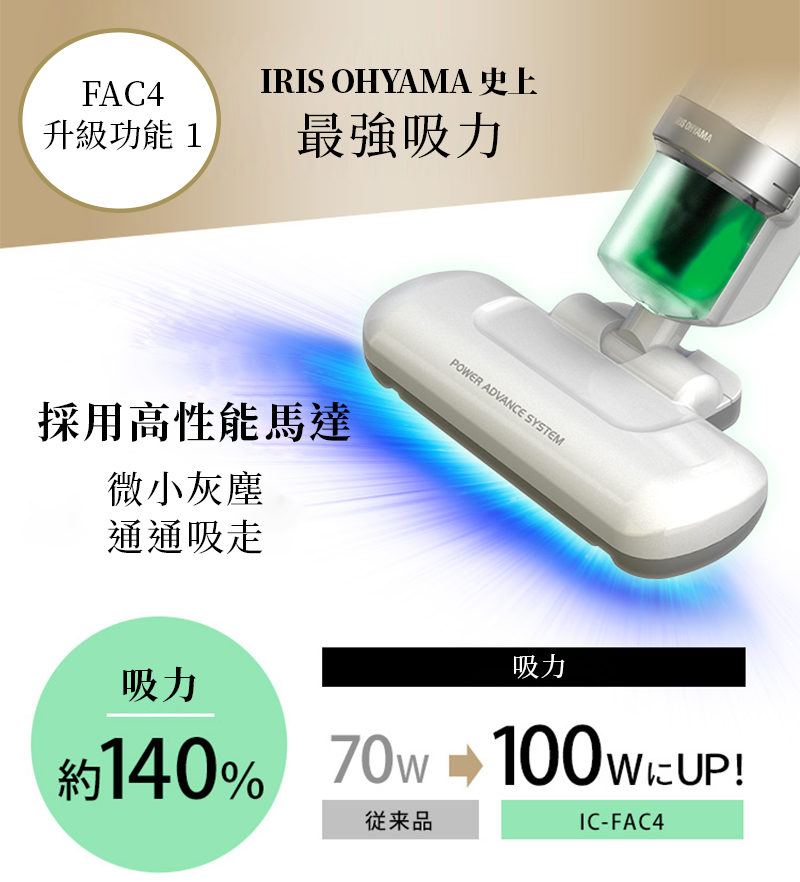 與FAC3 相比,每分鐘拍打次數由每分鐘7,000次大幅提升至14,000次,是IRIS OHYAMA 除塵蟎吸塵機的一大突破。高速拍打將隱藏之塵蟎拍打至床鋪表面,消除過敏原。
