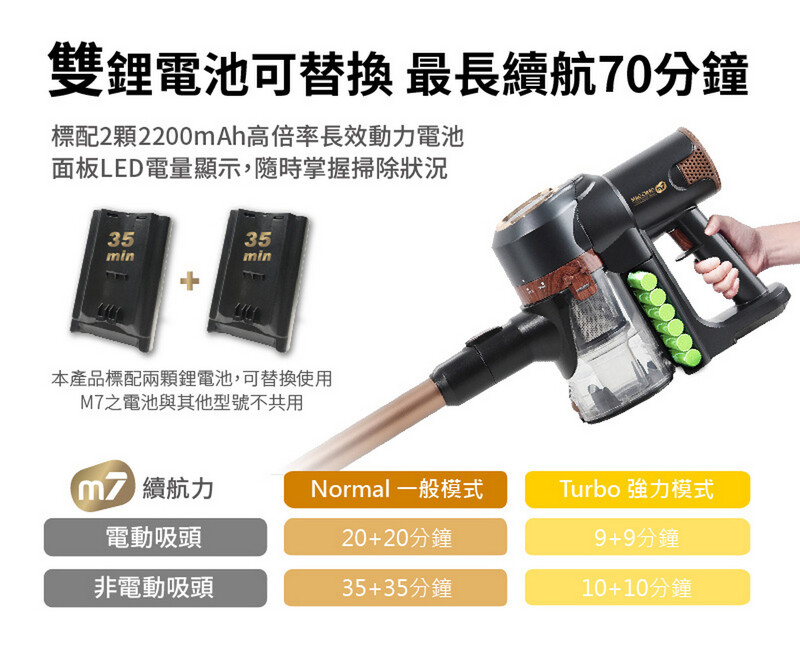 • 附送2粒2200mAh鋰電, 支援20分鐘超強模式吸塵或70分鐘標準模式吸塵