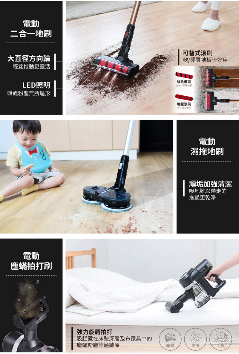 • 電動二合一濕拖地刷: 自轉濕拖加倍潔淨, 顆粒粉麈一Take KO