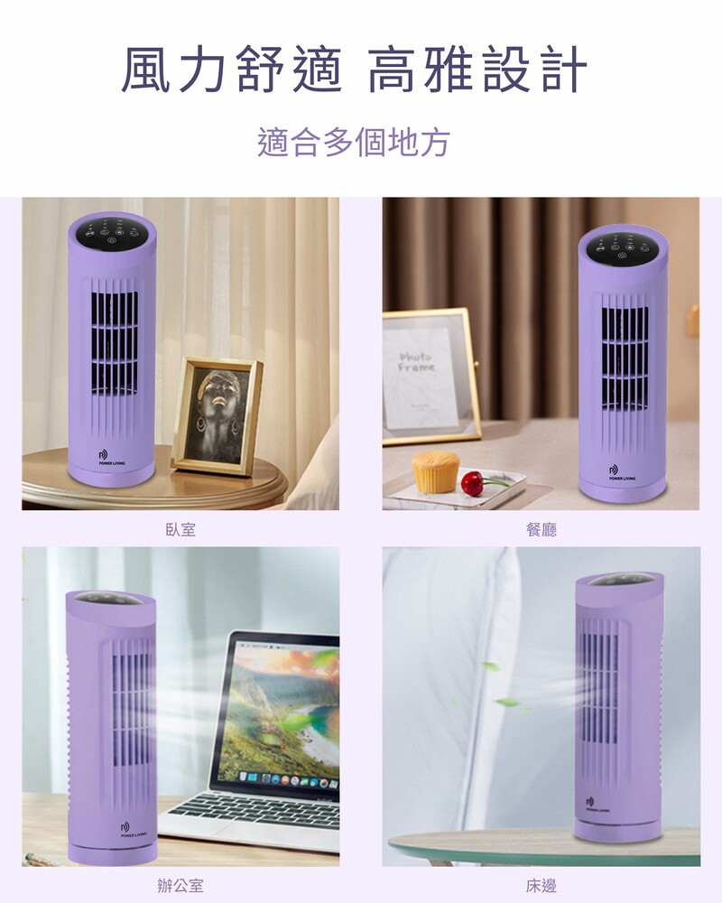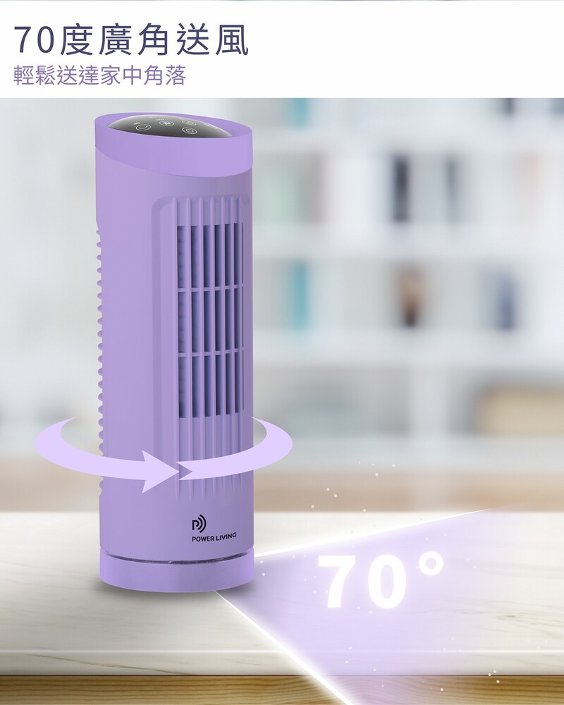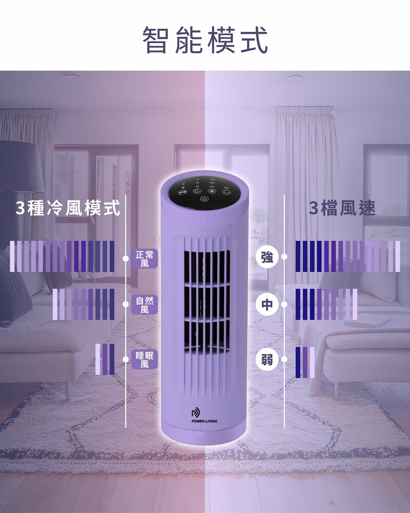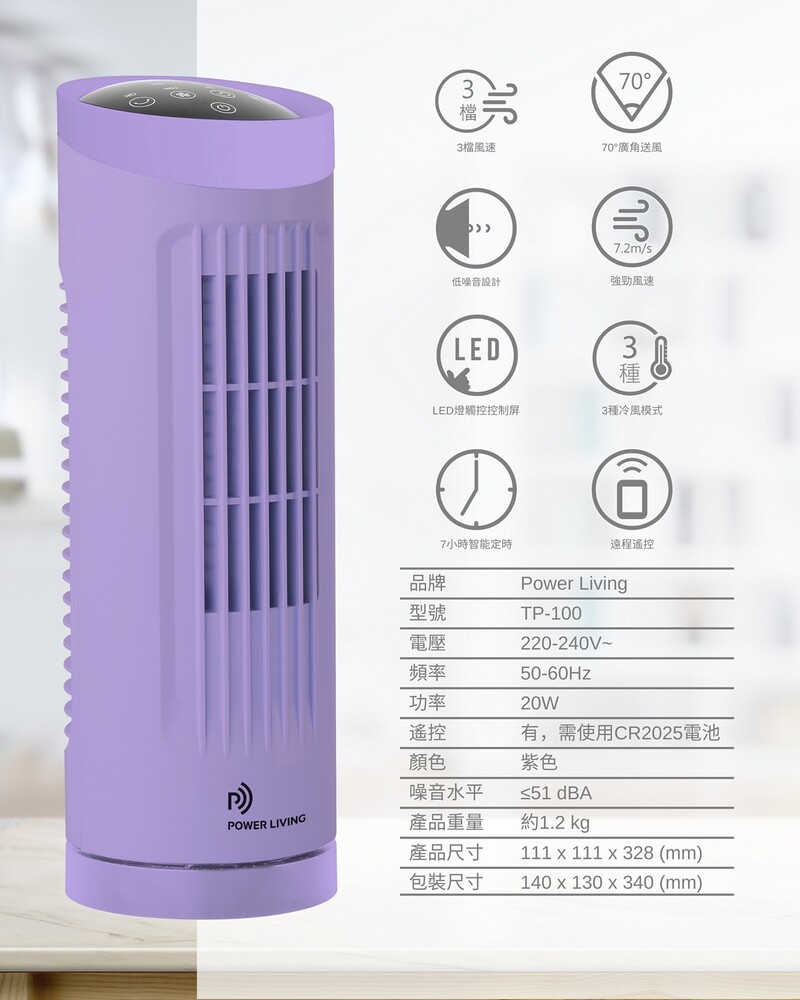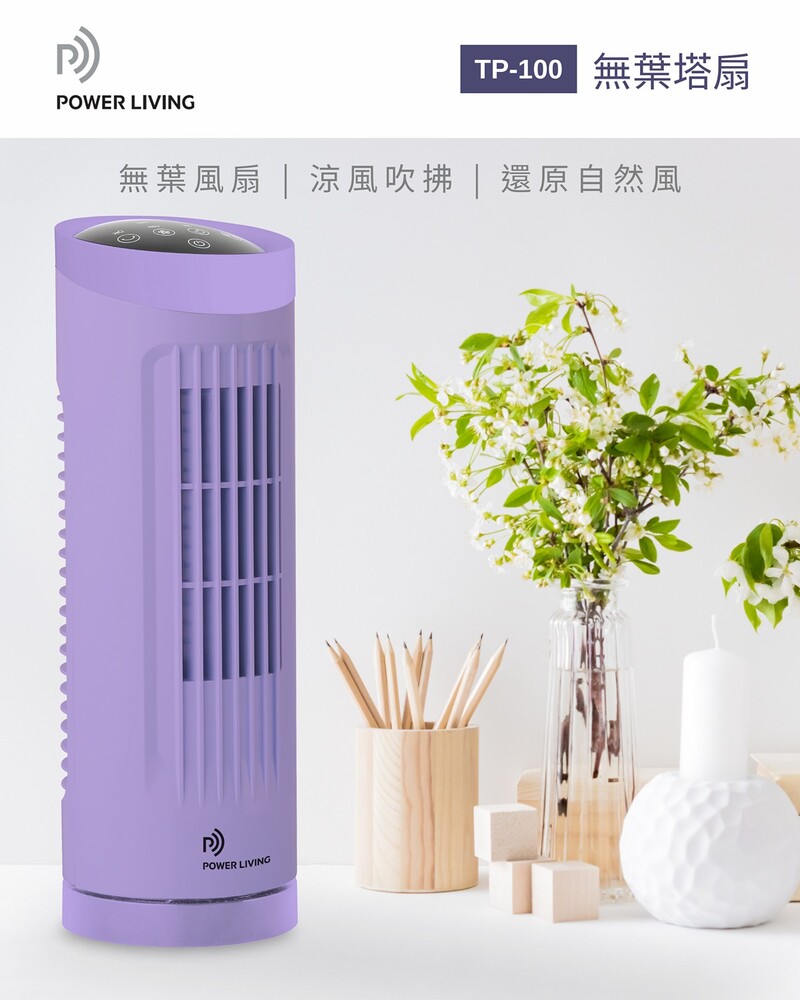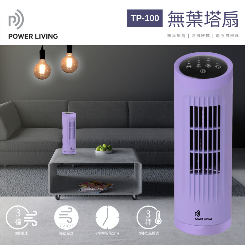 Power Living TP-100 無葉塔扇有3檔風速設定和3種冷風模式,包括正常、自然風和睡眠模式,滿足你各種需求。70度廣角送風,LED指示燈和觸控控制屏,操作更方便。強勁風速清涼透徹,運作寧靜無聲,遠程遙控更加方便。輕巧機身不佔位,長達7小時智能定時,讓你輕鬆享受清涼風。