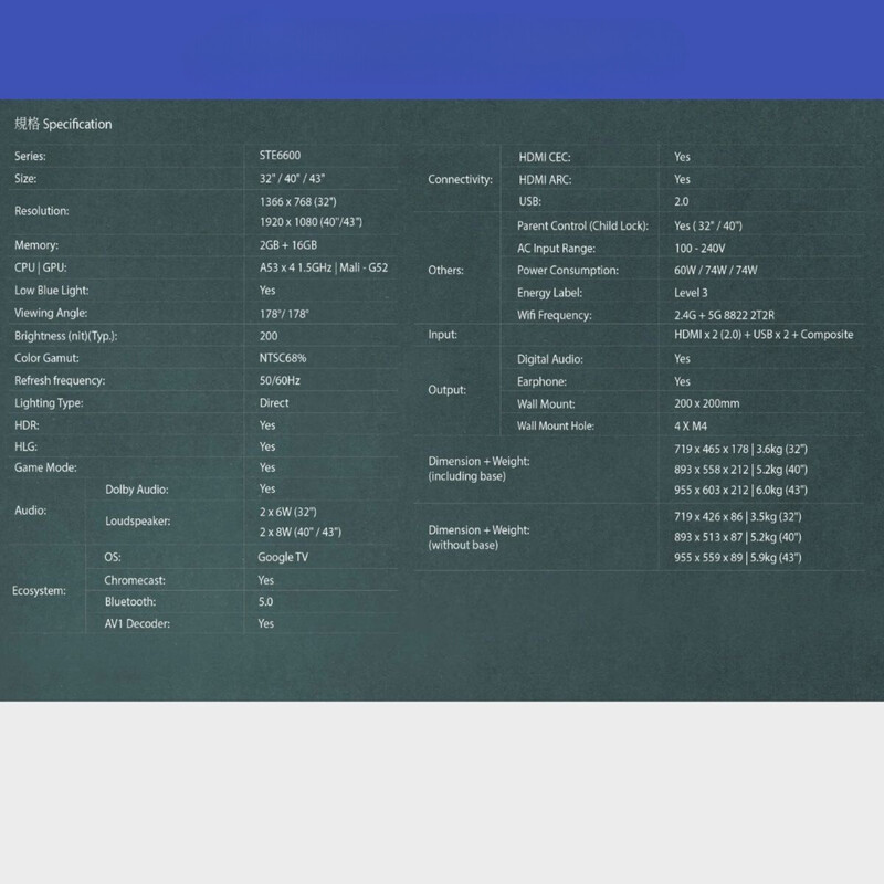 顯示器 : 1366x768 操作系統 : GoogleTV CPU : A53*4-1.5Ghz