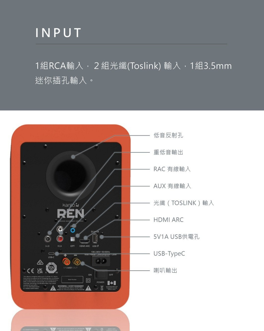 - 1組RCA輸入,2組光纖(Toslink) 輸入,1組3.5mm迷你插孔輸入