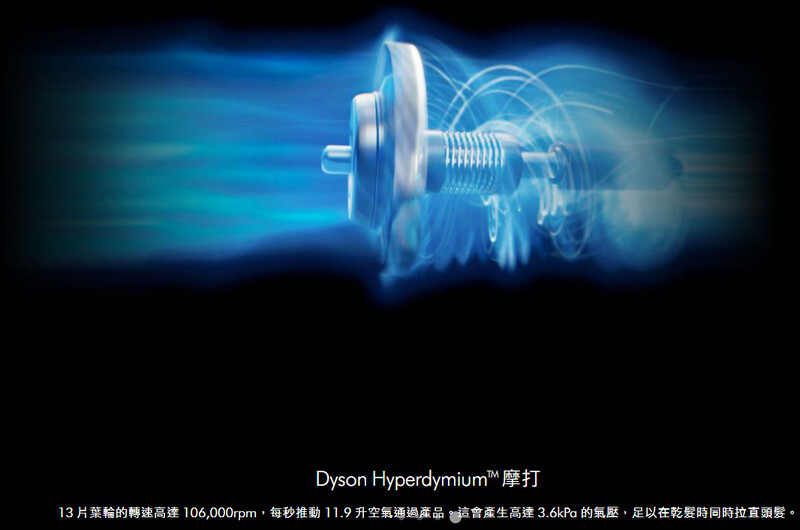 13片葉輪的轉速高達106,000 rpm,每秒推動11.9公升空氣通過產品。這會產生高達 3.6kPa 的氣壓,足以在乾髮時同時拉直頭髮。