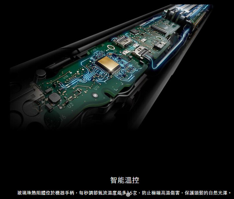 玻璃珠熱阻體位於機器手柄,每秒調節氣流溫度最多16次,防止極端高溫傷害,保護頭髮的自然光澤。