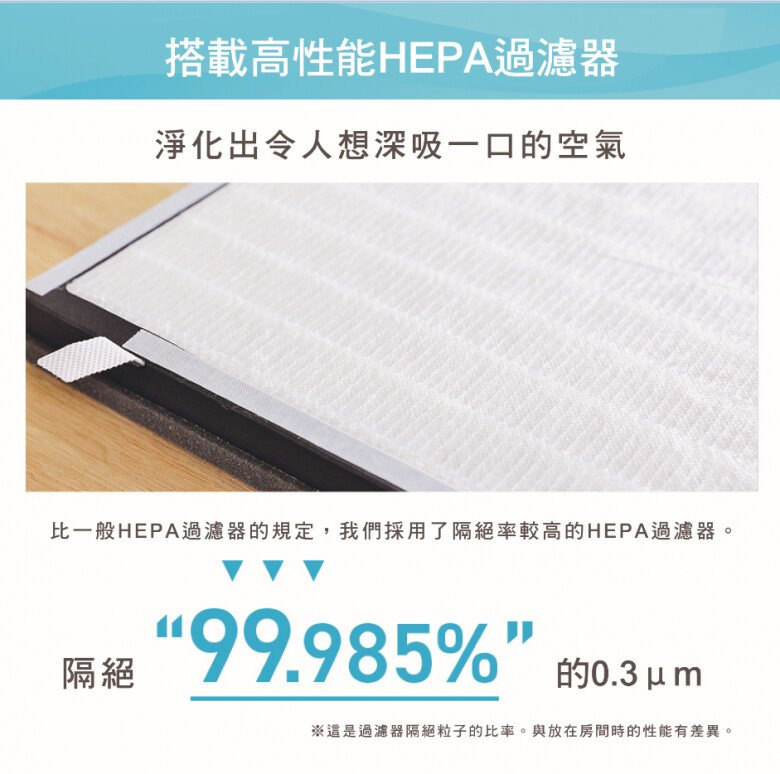 - 第二重靜電HEPA濾網, 能有效隔絕空氣中99.985% 0.3um塵埃, 花粉等致敏原(PM2.5)