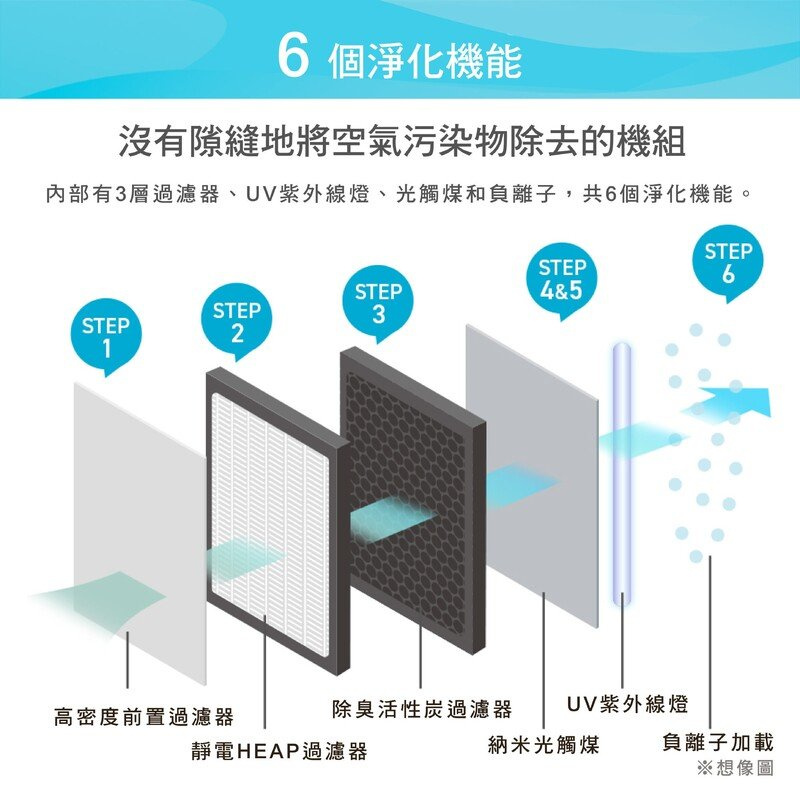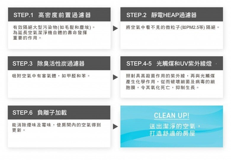 - 第六重負離子加載, 負離子釋放量達3百萬/cm2能消除煙味及霉味, 使房間內的空氣得到更新