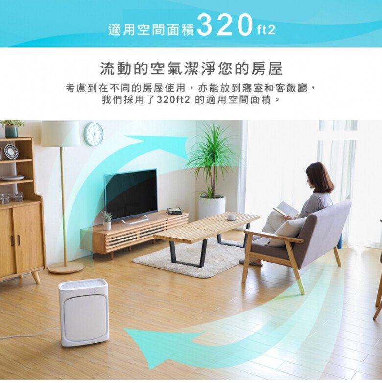 - 三段風速, 最高風量達230立方米/小時; 適用面積達320平方呎, 合睡房及客廳使用