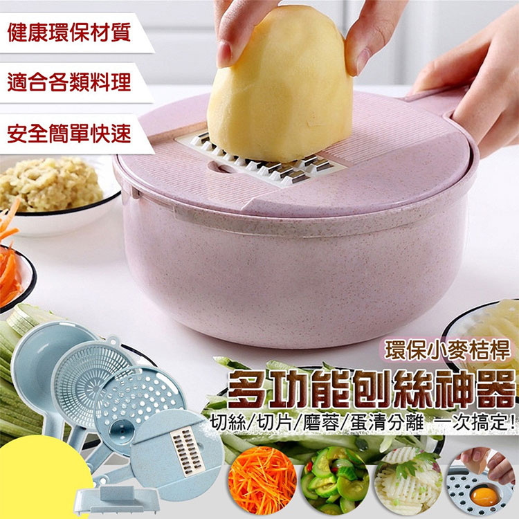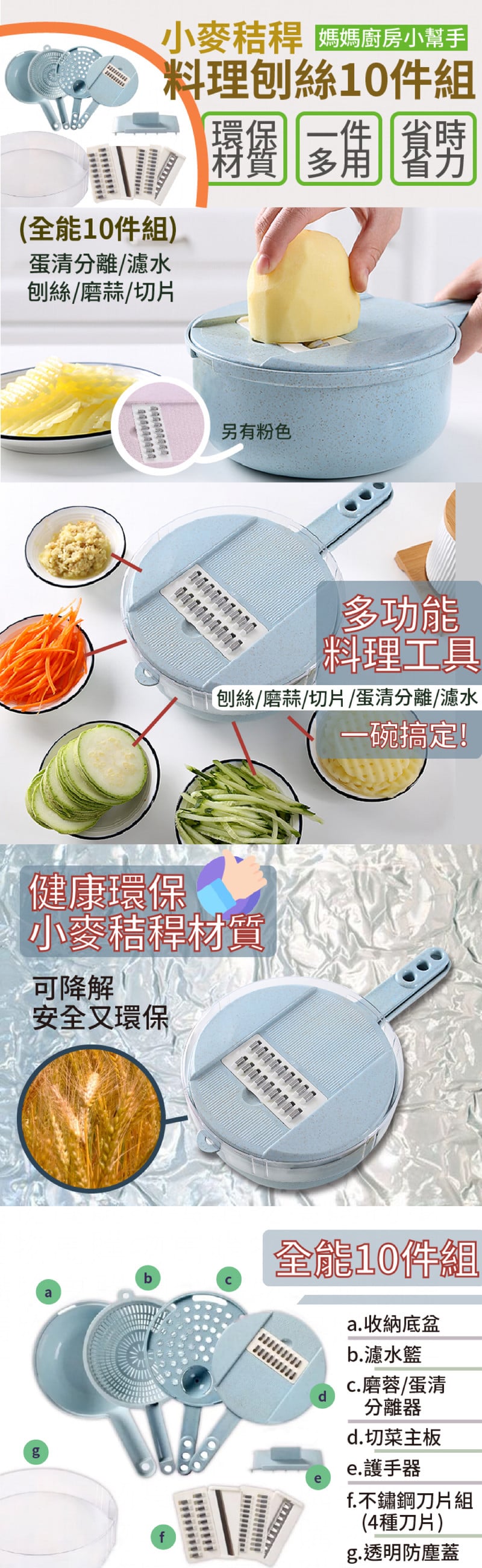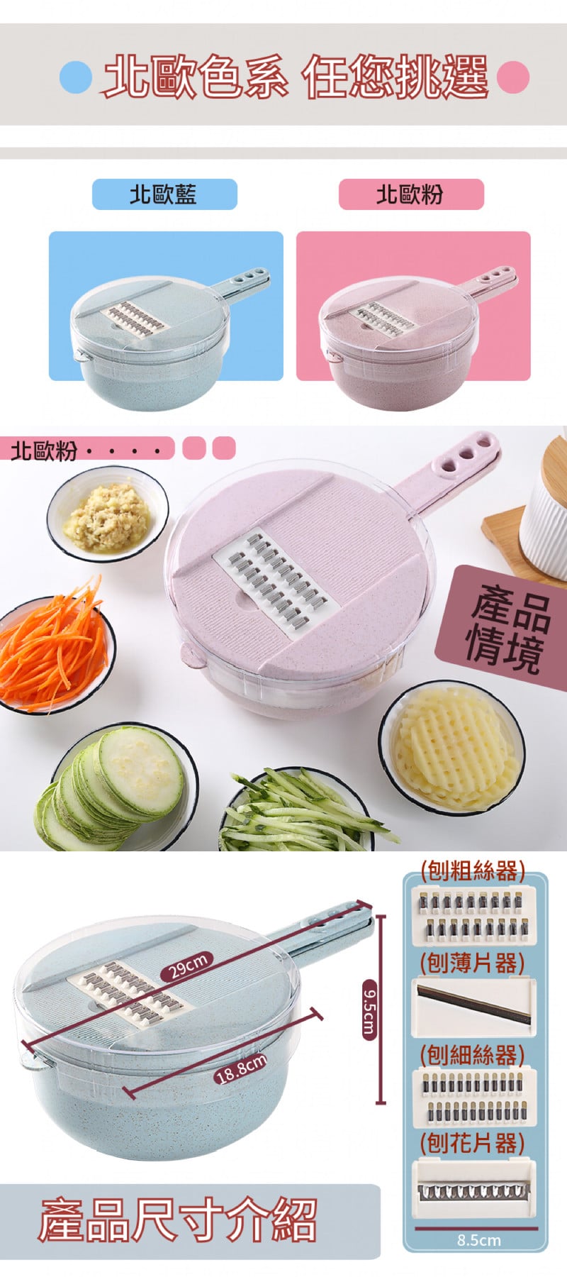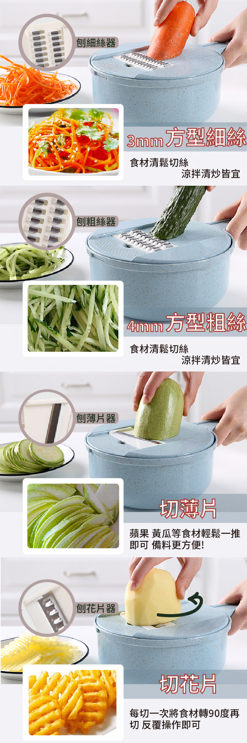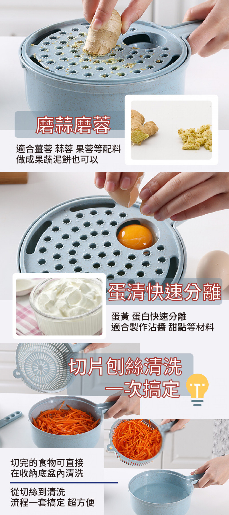- 內容:收納底盆x1、瀝水籃x1、切菜主板、刀片4款(刨細絲器x1、刨粗絲器x1、刨薄片器x1、刨花片器x1)、磨蓉+蛋清分離器x1、護手器x1、防塵透明蓋x1