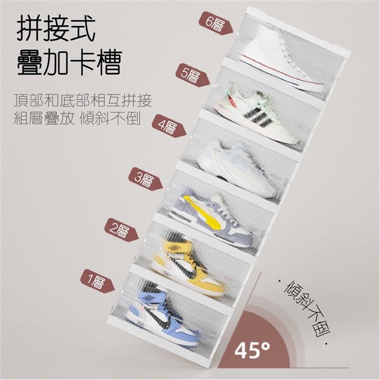 45°不易傾倒,鞋盒嵌入式卡槽,鞋盒頂部與底部緊密結合,固定不傾倒