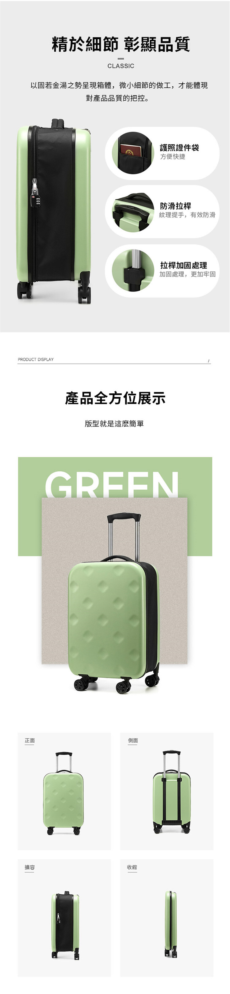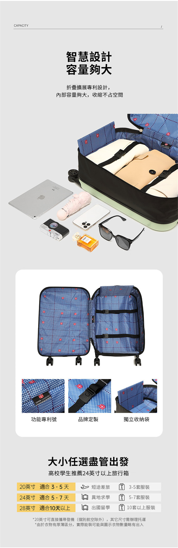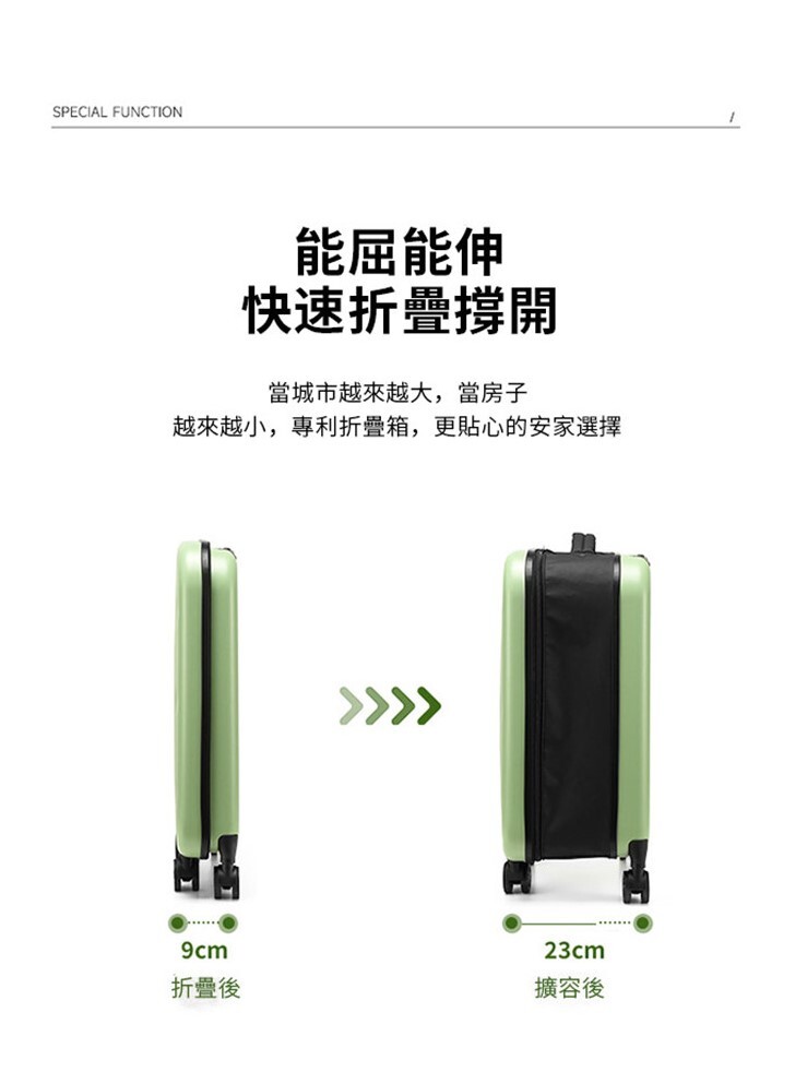 獨家摺疊擴展專利設計,內部容量夠大,摺疊後厚度只有9CM,大幅度節省家中行李箱放置空間