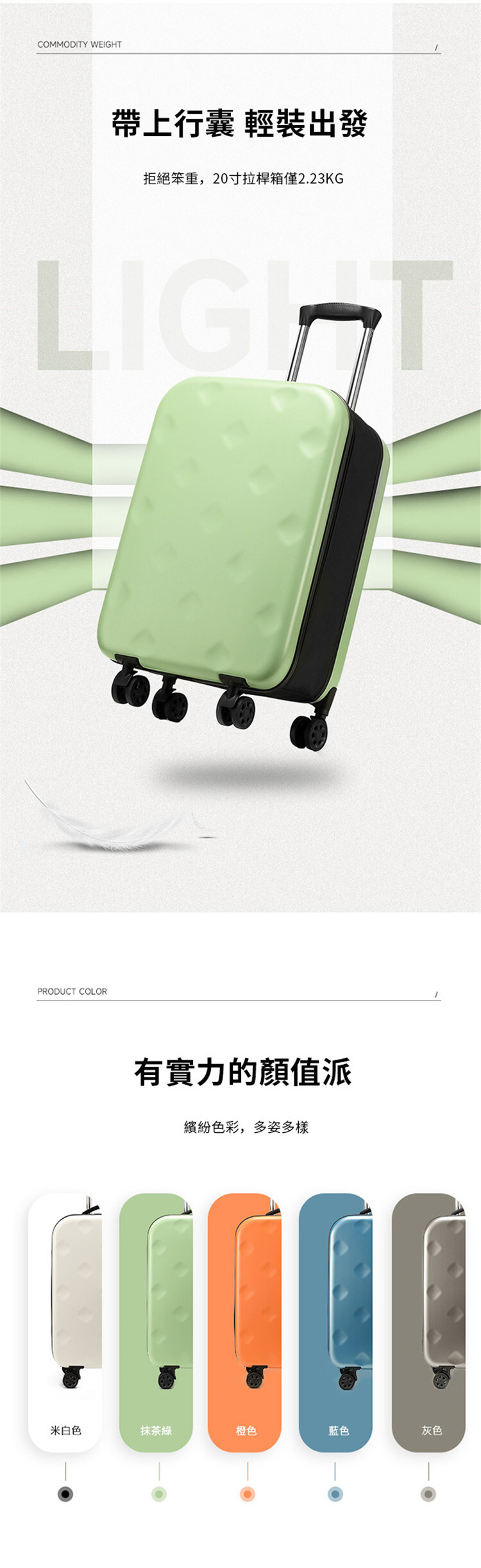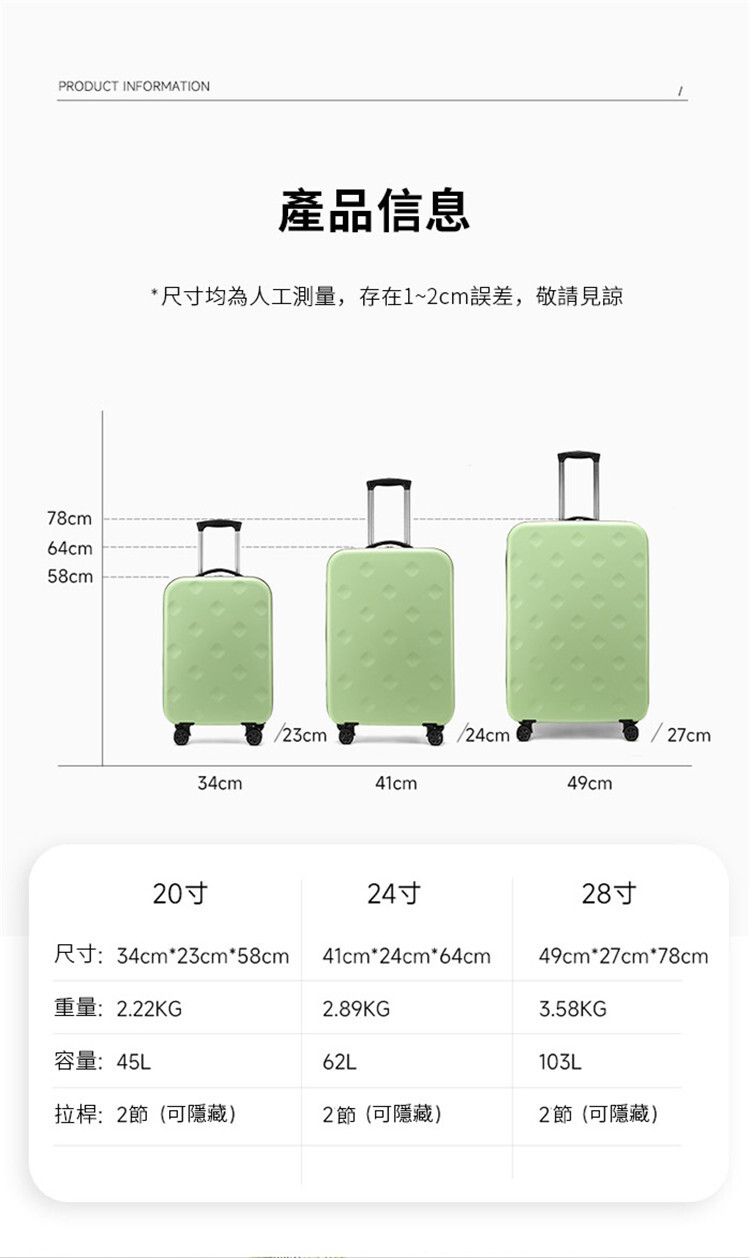 20寸尺寸:34cm * 23cm * 58cm重量:2.22KG容量:45L拉桿:2節(可隱藏)