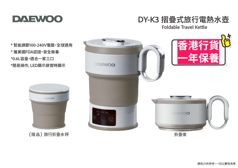 DAEWOO DY-K3 摺疊式旅行電熱水壺  智能調節100-240V電壓,全球適用