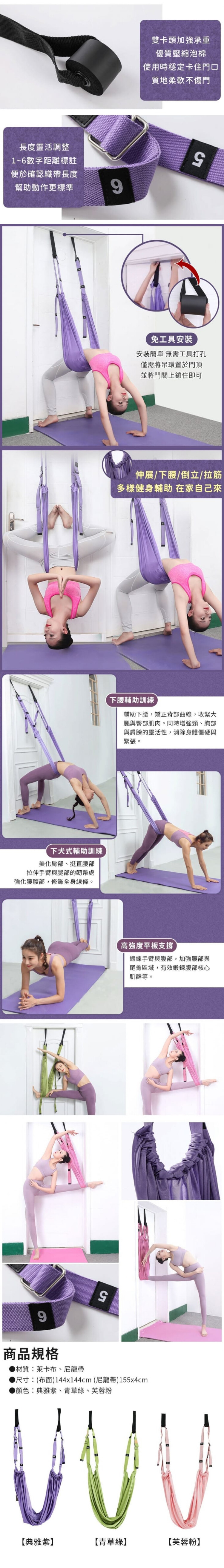 升級版空中瑜伽繩倒立伸展帶,結構優化、承重加強!利用門後空間,即可達到健身效果,可調節拉力帶,抗拉耐用,使用安心,配合高密度瑜珈床,讓妳做好各種花式技巧,簡單便捷輕鬆滿足自身訓練要求!
