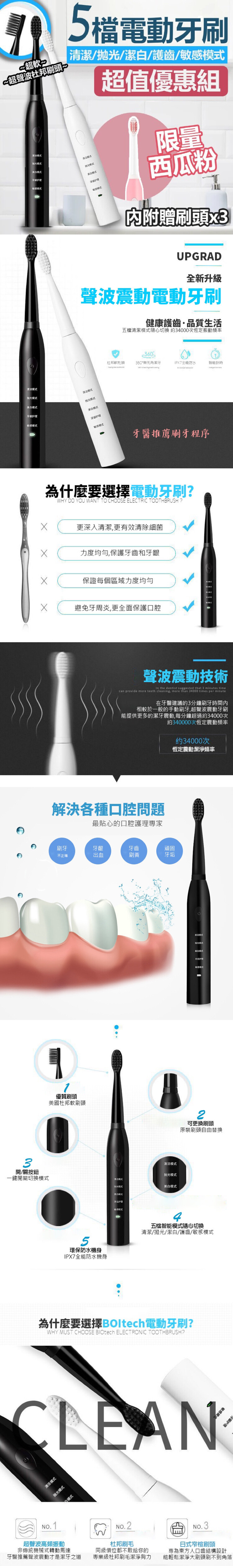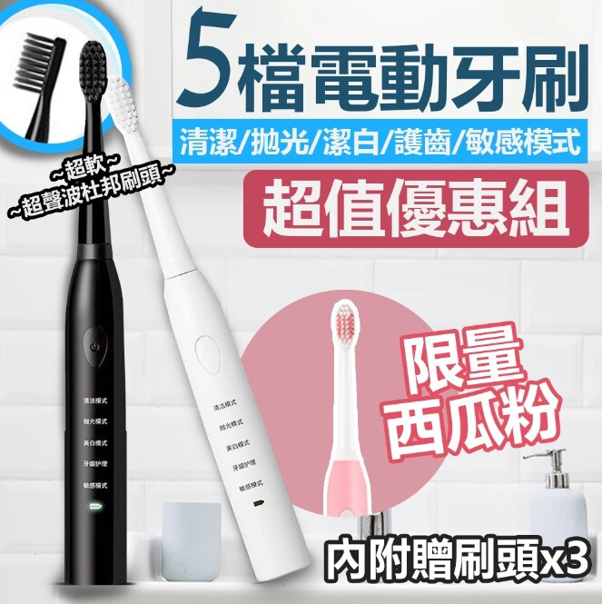 超聲波五檔電動牙刷(3色) 內附贈刷頭x4