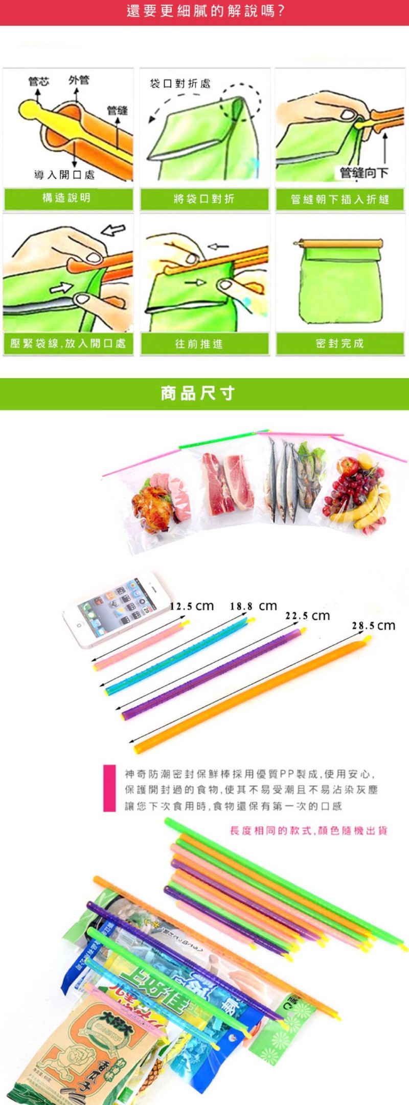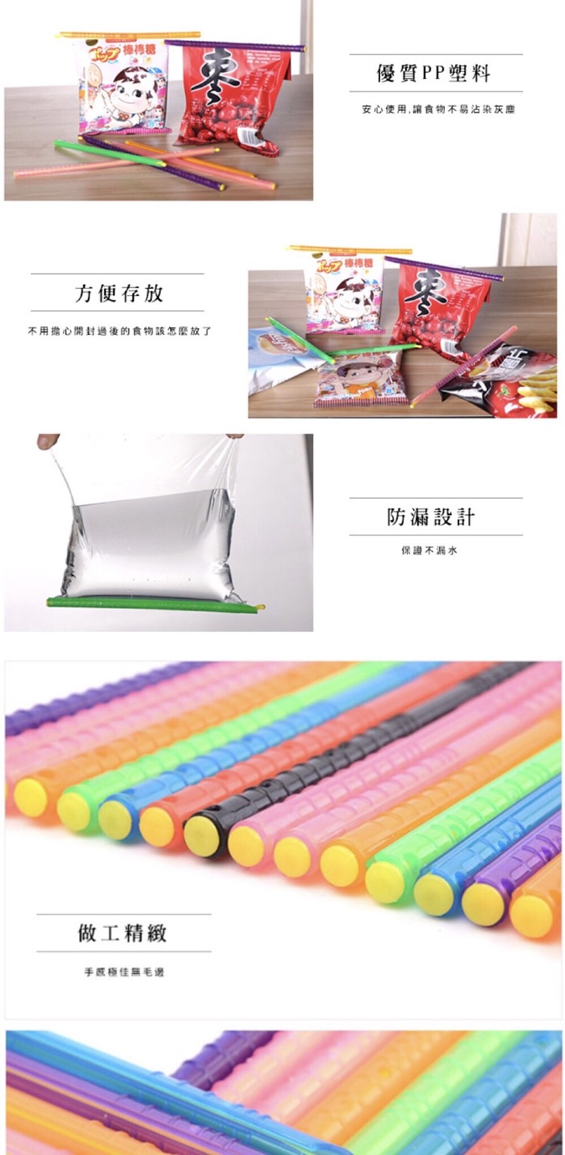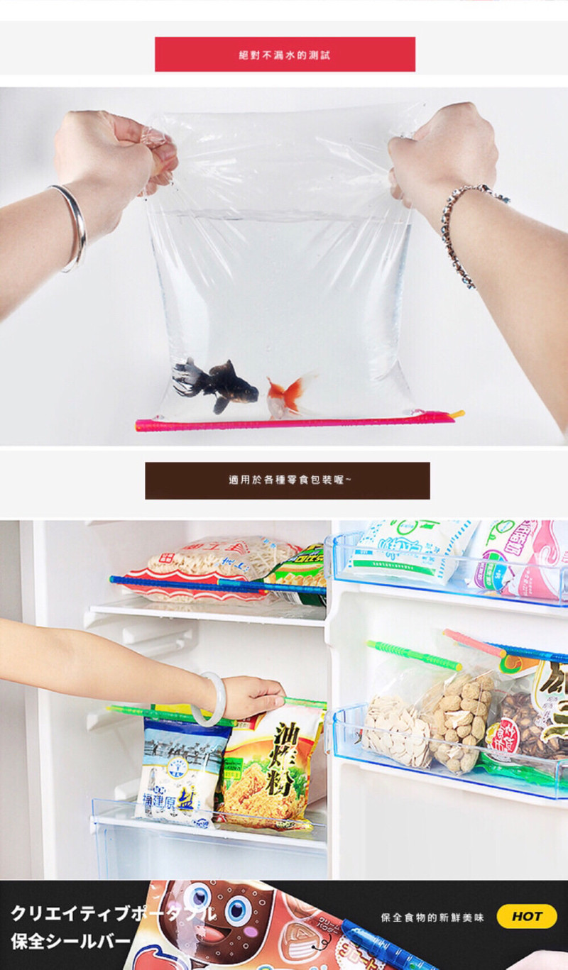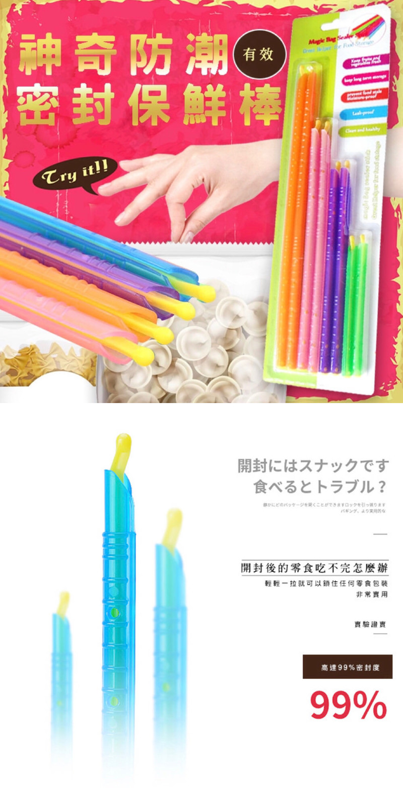 各位媽咪們是否被家中大大小小未吃完的餅乾、剩飯等保存困擾著呢?神奇防潮防水密封保鮮條,可重複使用、方便收納、不佔空間,完全密封不滲漏,防潮、防漏、保鮮,任何厚、薄塑膠袋或食材包裝皆可使用,輕鬆整理,還給你更大的儲藏空間。
