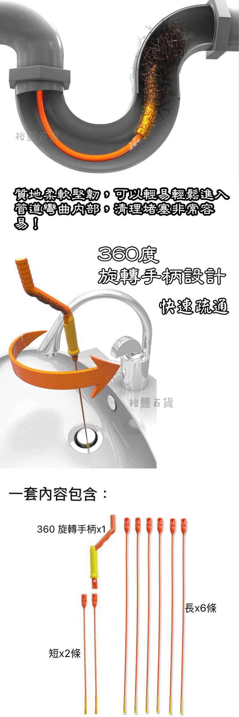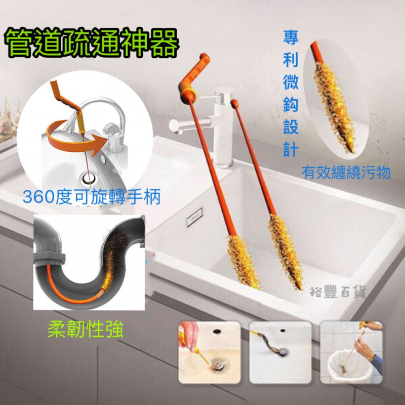廚房浴室水槽經常因為大量頭髮,細毛等物品堵塞而讓您煩惱針對管道疏通我們有了此產品,產品帶有倒刺,質地柔軟堅韌,可以輕易輕鬆進入管道彎曲內部,清理堵塞非常容易!