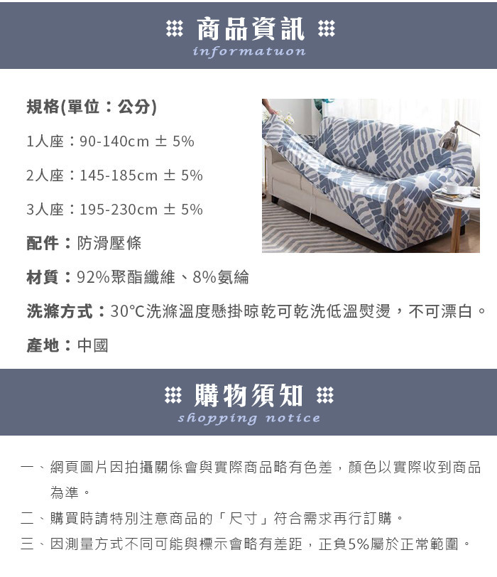 - 尺 寸:1人座90x90x(適用寬度85-140CM)/ 2人座90x90x(適用寬度145-185CM)/ 3人座90x90x(適用寬度190-230CM)