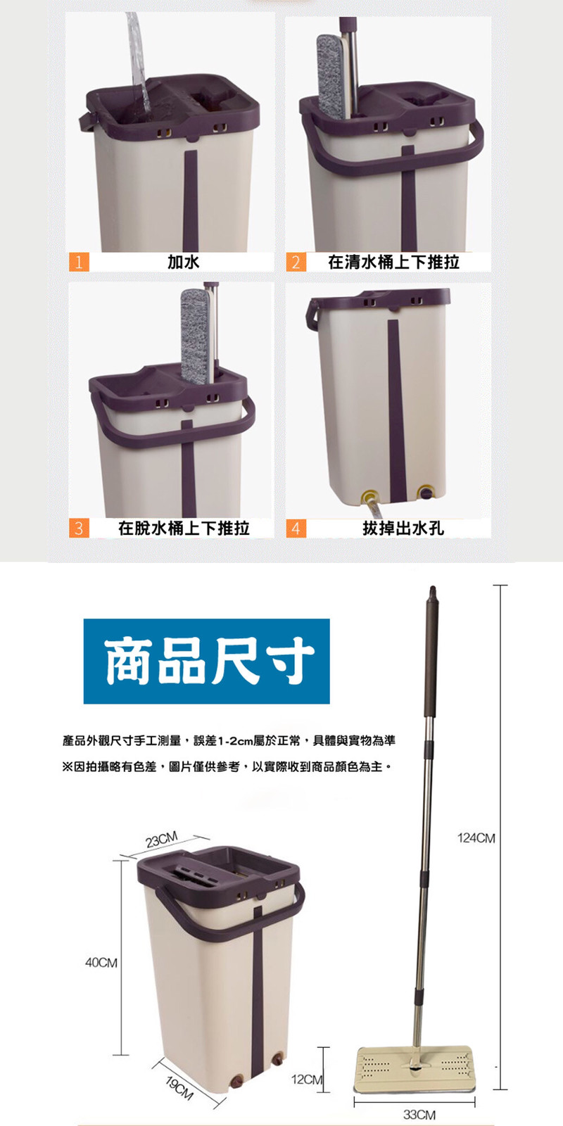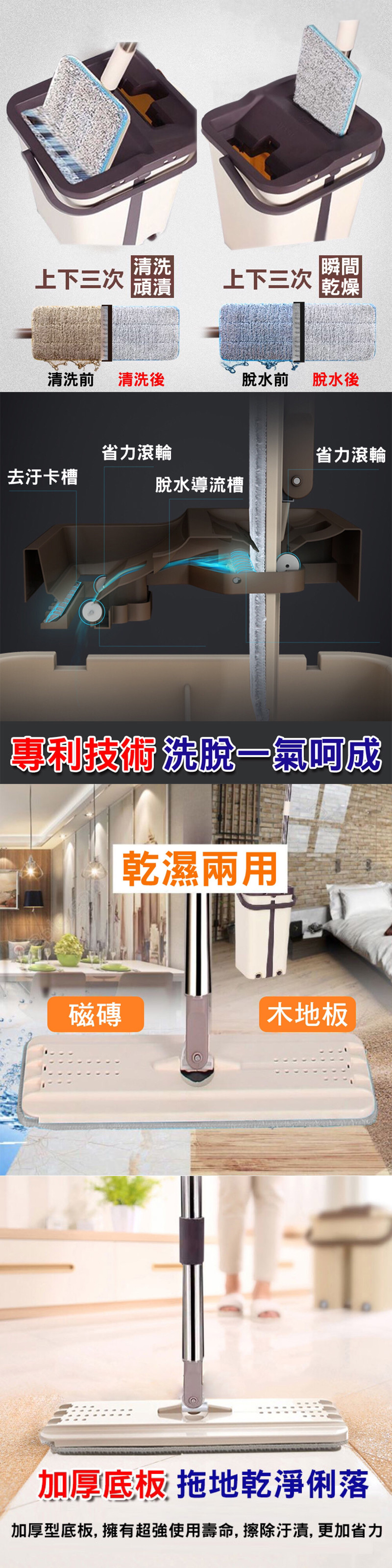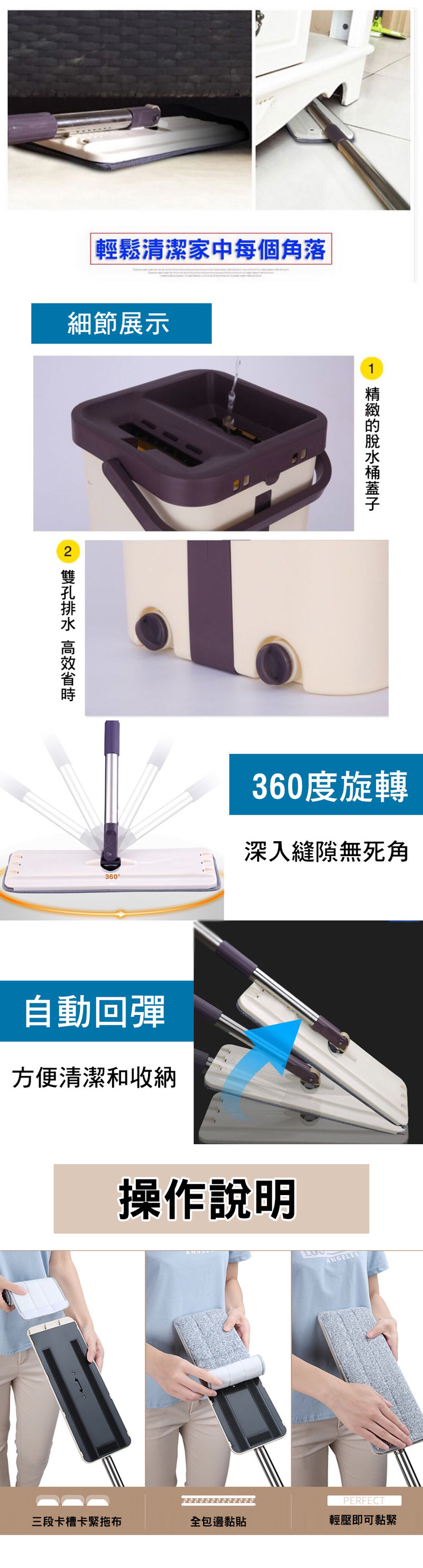 • 商品配件:拖把頭×1,拖把桿(三節)×1,脫水桶×1,超細纖維布×6,水塞2顆