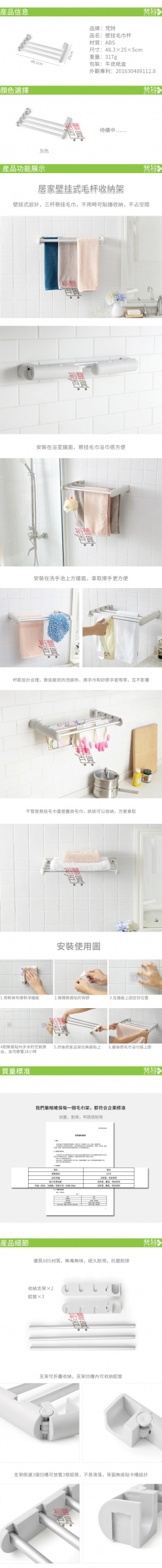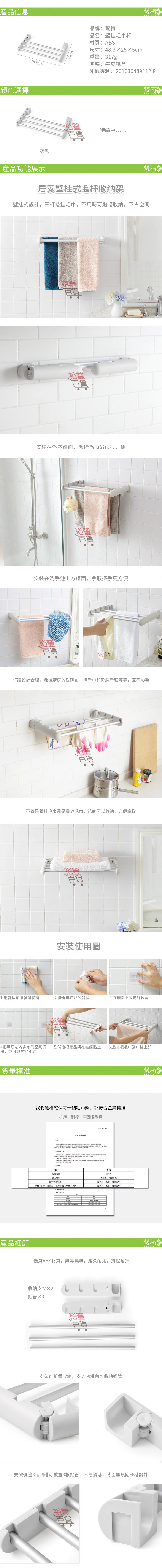 居家壁掛式毛巾掛桿,壁掛式設計,三桿懸掛毛巾,可貼牆收納,不佔空間,安裝在浴室牆面,懸掛毛巾浴巾很方便,不管是懸掛毛巾還是疊放毛巾,通通可以收納,方便使用。
