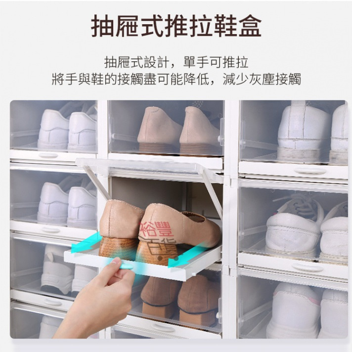 • 抽屜式推拉鞋盒設計,單手可推拉 將手與鞋的接觸盡可能降低,減少灰塵接觸,