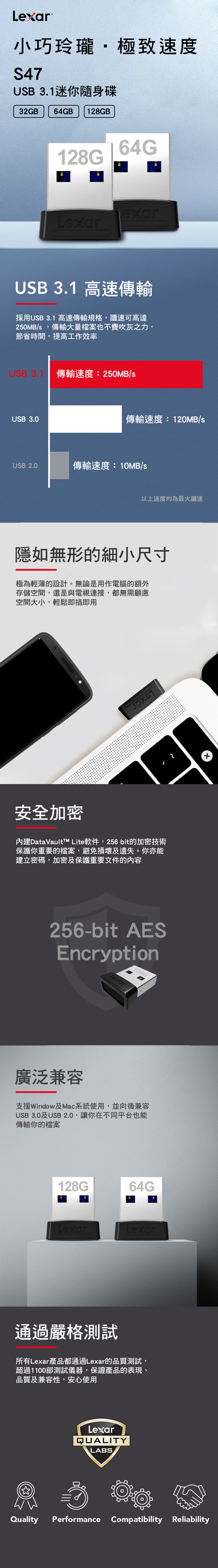 -USB 3.1快速存取 (讀速最大 250MB/s ) -迷你纖薄,即插即用 -DataVault™ Lite 及 256-bit AES 加密保護檔案 -USB 3.1 (Gen 1);支援PC 及 Mac® -向後支援USB3.0及2.0裝置 -5年有限保養