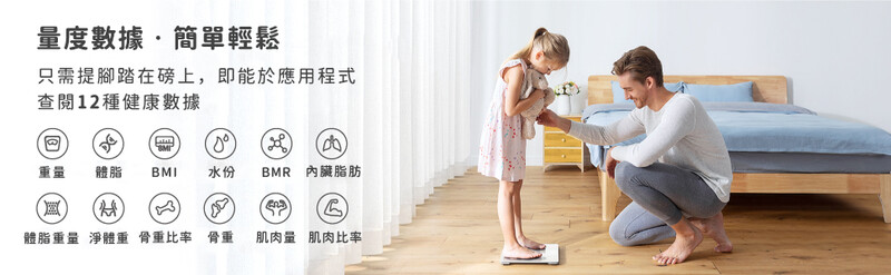 - 12種數據:體重、體脂、BMI、水份、肌肉比率、骨質比率、基礎代謝、內臟脂肪、淨體重、體脂質量、骨質量、肌肉量